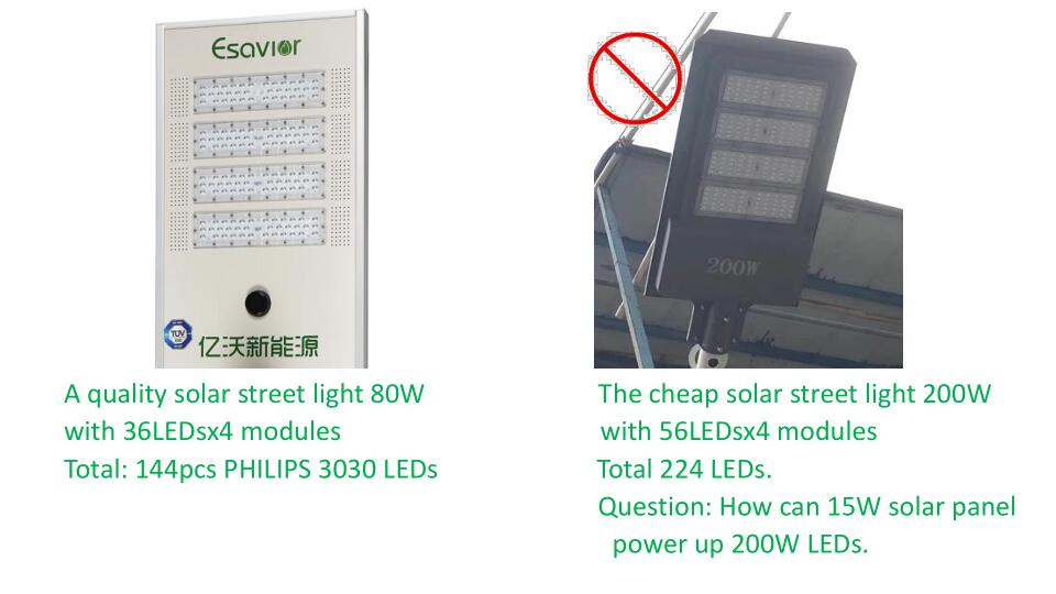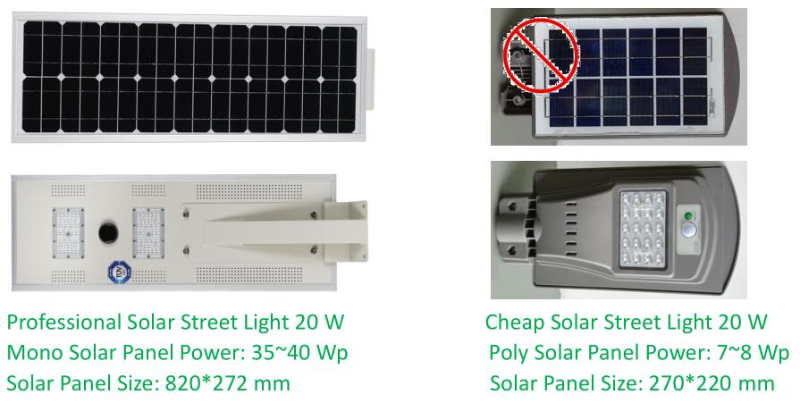 You might find solar street lights with the same nominal wattage and 10 times price difference. Some solar street lights with similar even the same appearance but 2~3 times price difference. This’s the current confusing situation on the market.