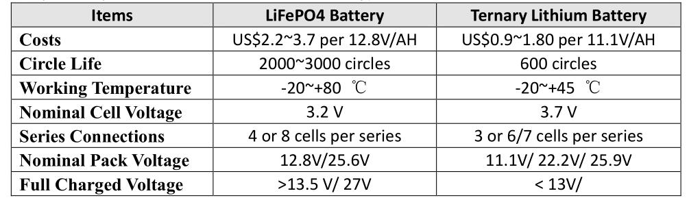 Battery Type: There’re mainly 2 different types of lithium batteries for solar street light on the market: “Lithium Phosphate Battery (LiFePO4)” and “Ternary Lithium Battery (Li(NiCoMn)O2”. The core difference of these 2 types of lithium batteries are as below: