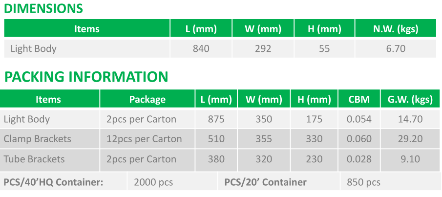 Packing & Weight | Light Body Size: | 840*292*55mm | ||