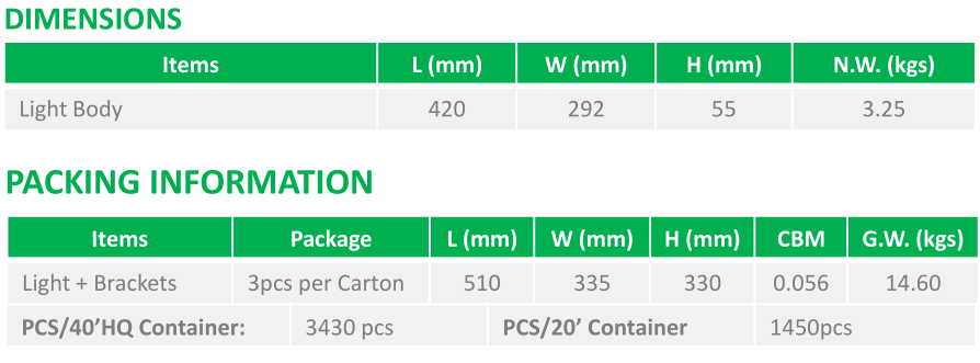 Packing & Weight | Light Body Size: | 420*290*55mm | ||