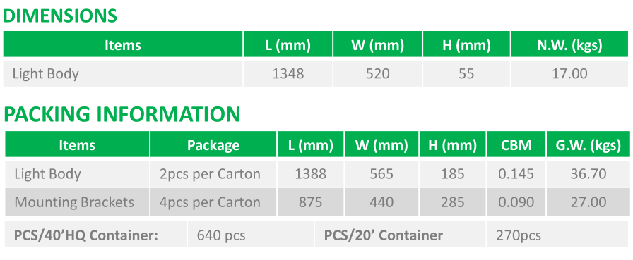 Packing & Weight | Light Body Size: | 1348*520*55mm | ||
