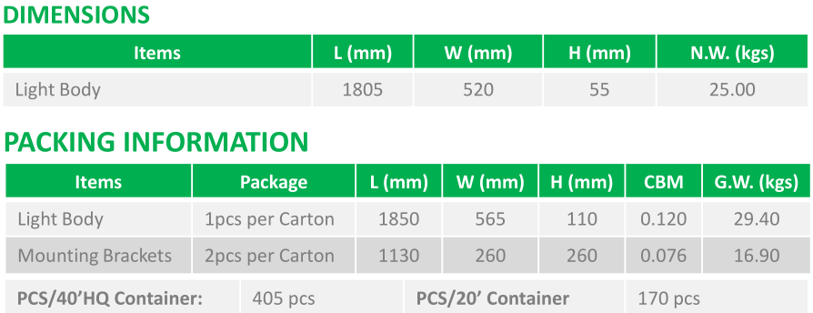 Packing & Weight | Light Body Size: | 1805*520*55mm | ||