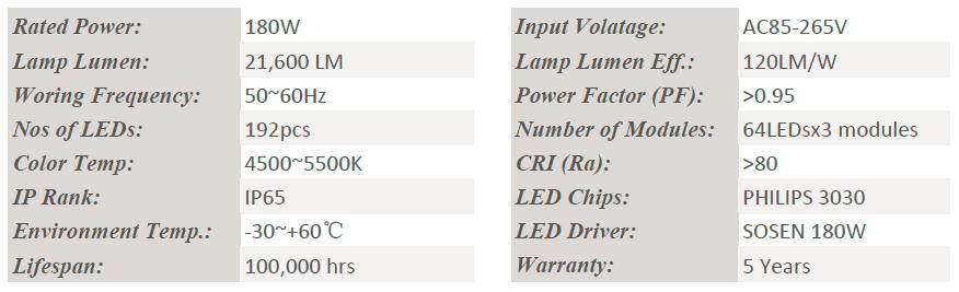 KEY SPECIFICATIONS: LED: 150W PHI3030/3535/5050 as optional